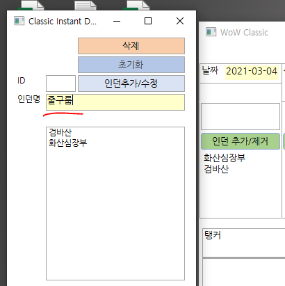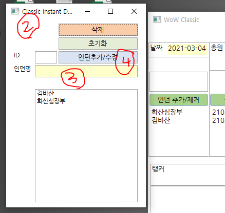 (3)노란색 필드에 원하는 인던이름을 적고 인던추가버튼(4)를 누르면