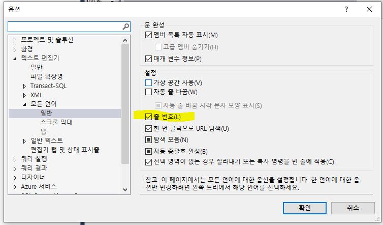 도구 > 옵션 > 텍스트 편집기 > 모든 언어 > 일반