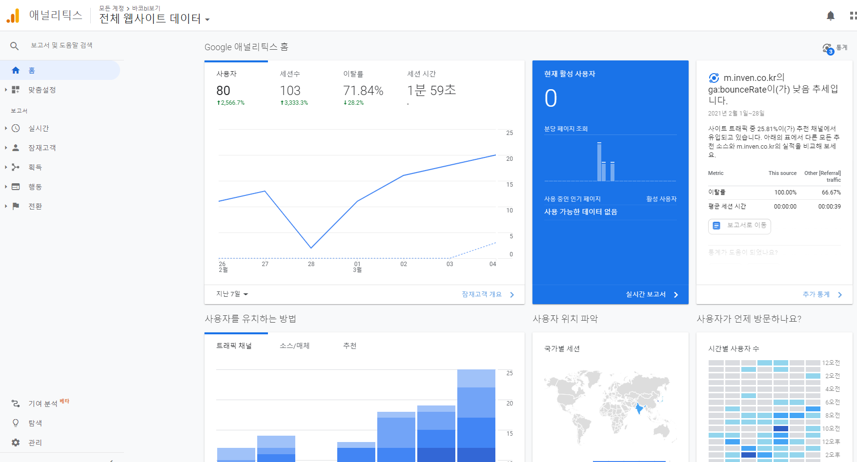 요즘 사용해보고 있는 구글 애널리틱스, 1번의 HTS와는 사뭇다른 느낌이지만, 둘다 데이터를 기반으로 한 인터페이스다. 이 프로그램 역시 무료로 사용이 가능하며, 티스토리 블로그에 연동해서 사용가능하다.