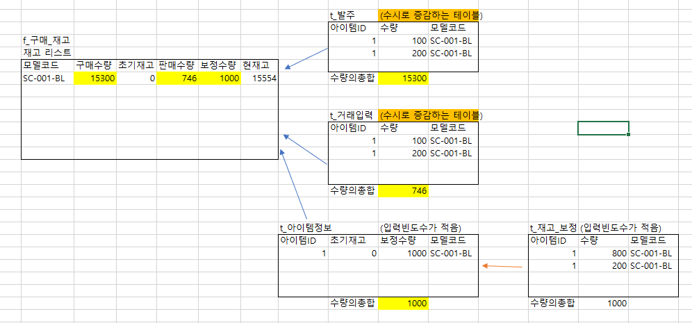위 그림은 모델을 그림으로 표현한 도식입니다. 36강에서는 'f_구매_재고'의 '재고리스트'에서 현시점의 재고를 구하는데 그쳤지만, 이제 기능을 하나 더 추가해보기 위해서 't_재고_보정'이라는 테이블을 생성했습니다.