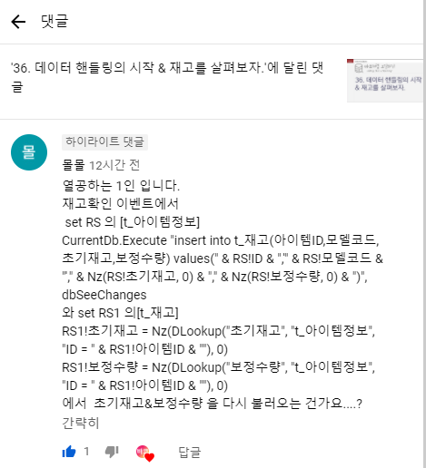 -----<코드 원문>------ Dim RS As DAO.Recordset, RS1 As DAO.Recordset '(1) If RS.RecordCount Then CurrentDb.Execute "insert into t_재고(아이템ID,모델코드,초기재고,보정수량) values(" & RS!ID & ",'" & RS!모델코드 & "'," & Nz(RS!초기재고, 0) & "," & Nz(RS!보정수량, 0) & ")", dbSeeChanges '(2) Loop Until RS.EOF End If RS.Close set RS = Nothing