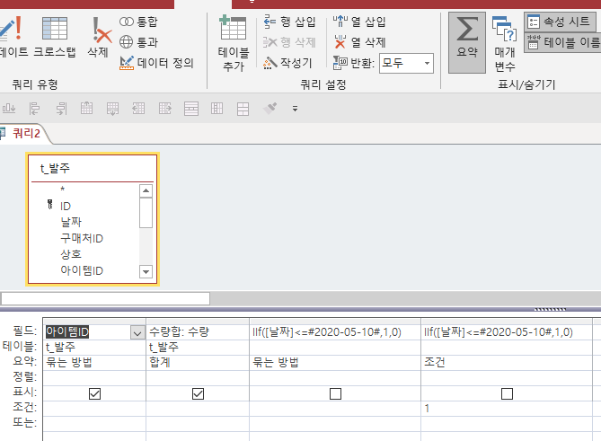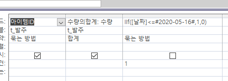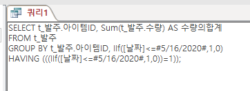 | '1) 전월의마지막날과 같거나 작은 날의 합계를 구한다. (전월이월) '전월이월 = 초기재고 + 구매수량(전월) - 판매수량(전월까지) Set RS = CurrentDb.OpenRecordset("select 아이템ID, Sum(수량) as 수량합 from t_발주 " & _ "WHERE IIf([날짜]<=#" & BLday & "#,1,0)=1 GROUP BY 아이템ID, IIf([날짜]<=#" & BLday & "#,1,0) ", dbOpenDynaset, dbSeeChanges) 2020-5-10일자 기준 쿼리생성결과(위의 코드 굵은 글자를 쿼리로) ![]() SQL Tip: 위의 코드에서 #" & BLday & "#를 사용했는데, 아래의 SQL 코드는 날짜를 직접 넣었습니다. 이유: 쿼리와 폼안에 귀속된 변수인 BLday는 연결고리가 없습니다. 고로 변수를 공용변수로 만들어서 테스트 할수도 있고, 아니라면 날짜형의 예를 넣어서 테스트를 해보는 방법이 있습니다. 이후, 날짜형을 변수로 변경해주면 됩니다. select 아이템ID, Sum(수량) as 수량합 from t_발주 WHERE IIf([날짜]<=#2020-05-10#,1,0)=1 GROUP BY 아이템ID, IIf([날짜]<=#2020-05-10#,1,0) ![]() 디자인보기 ![]() 역으로 쿼리를 만들고 레코드셋을 만들때 ![]() ![]() ![]() Set RS1 = CurrentDb.OpenRecordset("select 아이템ID, Sum(수량) as 수량합 from t_거래입력 " & _ "WHERE IIf([날짜]<=#" & BLday & "#,1,0)=1 GROUP BY 아이템ID, IIf([날짜]<=#" & BLday & "#,1,0) ", dbOpenDynaset, dbSeeChanges) |