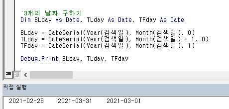 | '3개의 날짜 구하기 Dim BLday As Date, TLday As Date, TFday As Date BLday = DateSerial(Year(검색일), Month(검색일), 0) TLday = DateSerial(Year(검색일), Month(검색일) + 1, 0) TFday = DateSerial(Year(검색일), Month(검색일), 1) Debug.Print BLday, TLday, TFday |