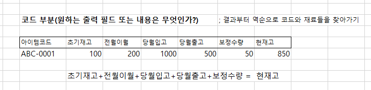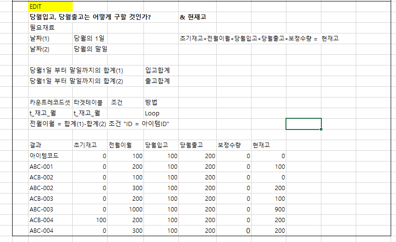 현재고를 구하기까지의 순서를 먼저 적겠습니다. (위에서 했던 부분에 중복 및 수정되는 부분도 있습니다.)