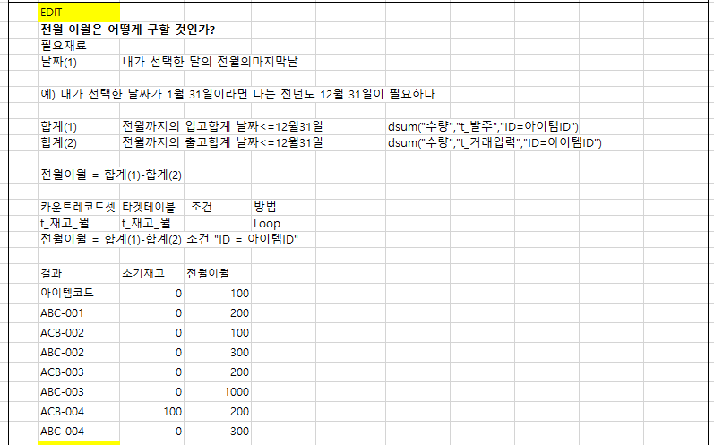 1) [t_재고_월] 과 [t_재고_전월] Delete : 테이블 초기화 개념, 이 두 테이블은 계산한 정보를 적어두는 장소로 사용한다.