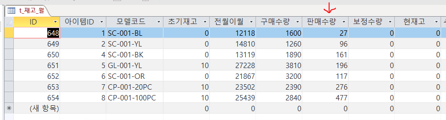 구매수량, 초기재고, 판매수량, 현재고, 보정수량 중 날짜에 영향을 안받는 필드를 찾아봅니다.