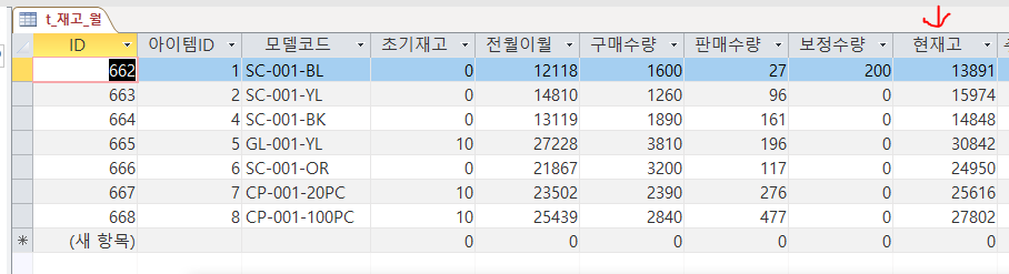 불러올 테이블은 [t_재고_월]이라는 테이블이고 여기서 리쿼리를 시켜주는 코드를 넣어주면 됩니다.