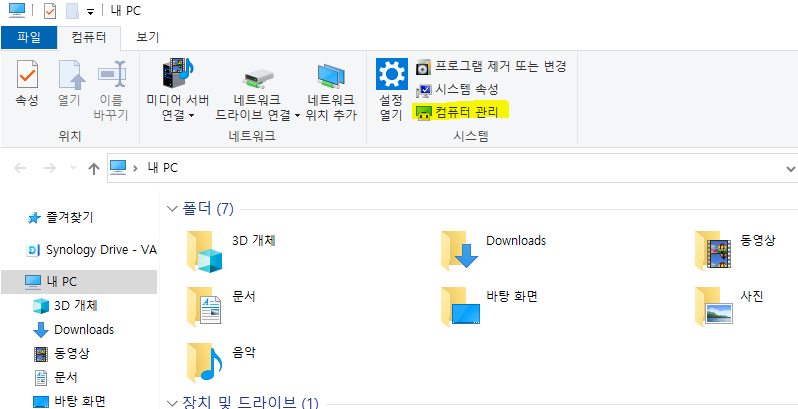 바탕화면에 '내 컴퓨터'를 열면, 아래 그림의 노란 줄 친 "컴퓨터 관리" 클릭!!