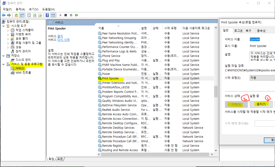 서비스 및 응용프로그램 > 서비스 > print Spooler (더블클릭하면)