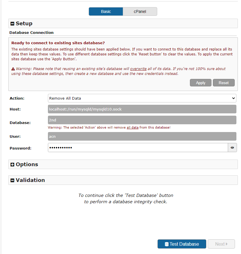 하단에 test Databse 누르고 문제가 없으면 Next가 활성화 됩니다. Next