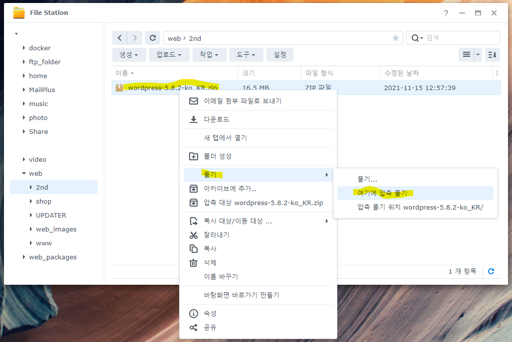 이제 로컬에 설치된 워드프레스 사이트를 시놀로지로 옮기겠습니다.