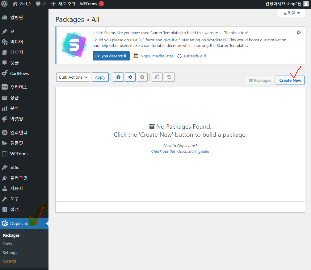 설치가 완료되면, Astra 테마, Starter Templates를 설치합니다. 추가로 Duplicator도 설치합니다.