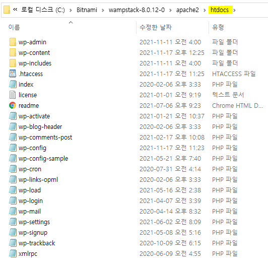 그 뒤에 위의 그림속 화살표 표시 아래에 있는 Open Application Folder를 클릭하시고, apache2 > htdocs 폴더를 찾아 내용을 삭제하고 그림과 같이 워드프레스 초기 파일을 압축을 풀어 놓습니다. 경로 확인해주세요.
