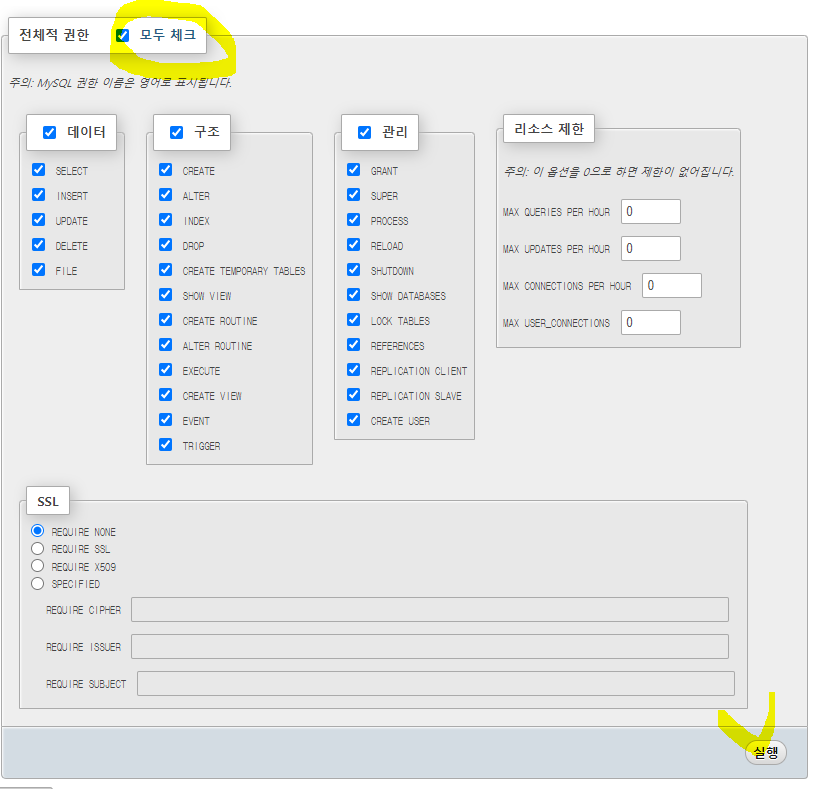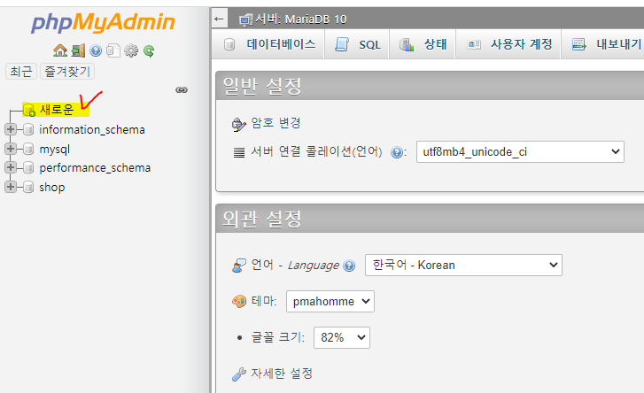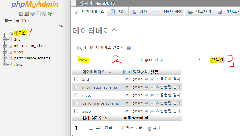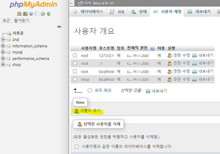 phpMyAdmin에서 계정생성해주시고, DB를 생성합니다.