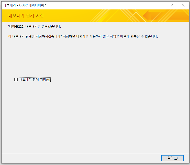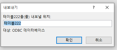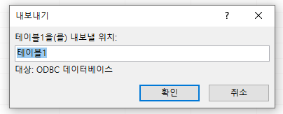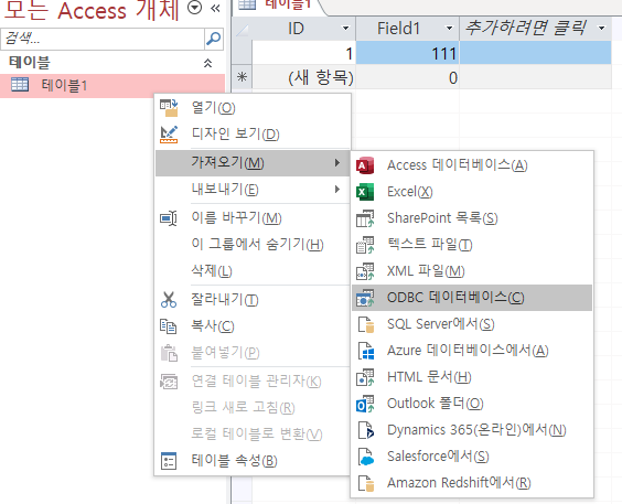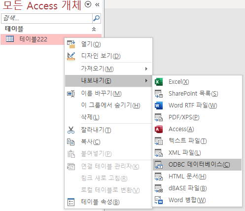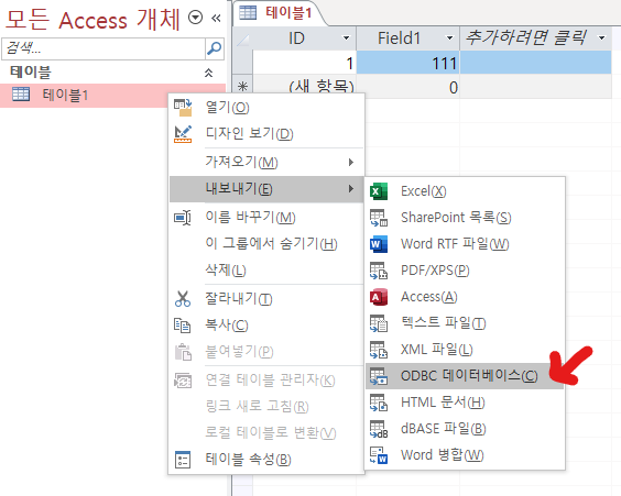 테이블1 우클릭, 내보내기 , ODBC 데이터베이스 선택
