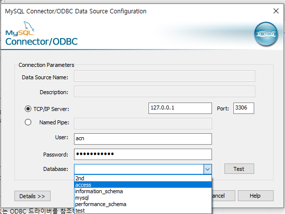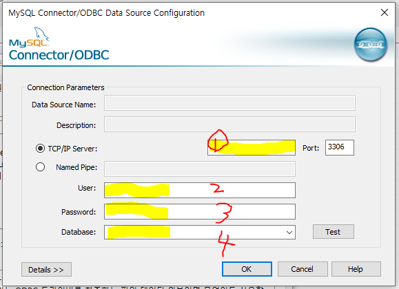 4) 1~3번까지 정상적으로 설정을 하셨다면, 드랍다운(4)을 누르시면 DB명이 뜹니다. DB명 선택 한후 OK