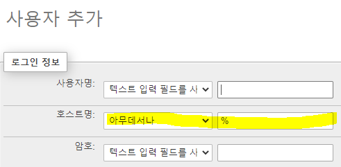 로컬 사용자는 localhost로 만들어도 무방하나 추후에 도메인 접속을 하실분은 % 로 만들어 계정을 설정해줍니다.