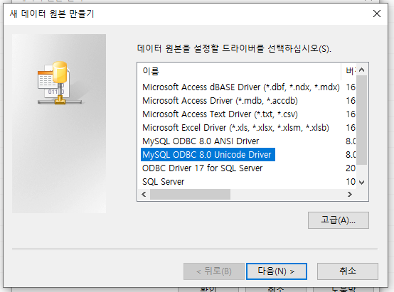 MySql ODBC 8.0 Unicode Driver 선택, 다음 클릭