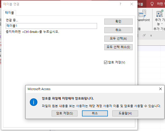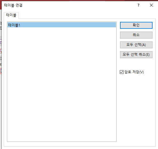 가져올 테이블 선택, 암호저장 체크 표시, 확인